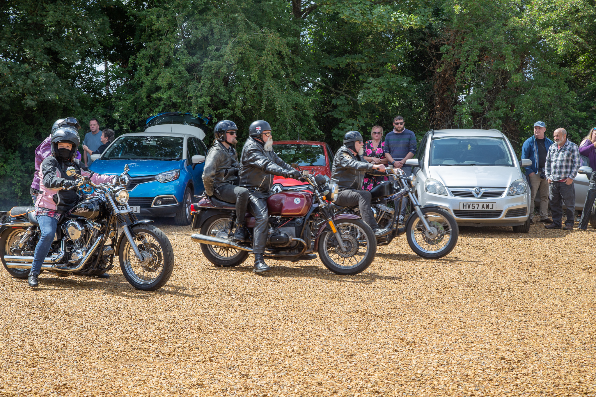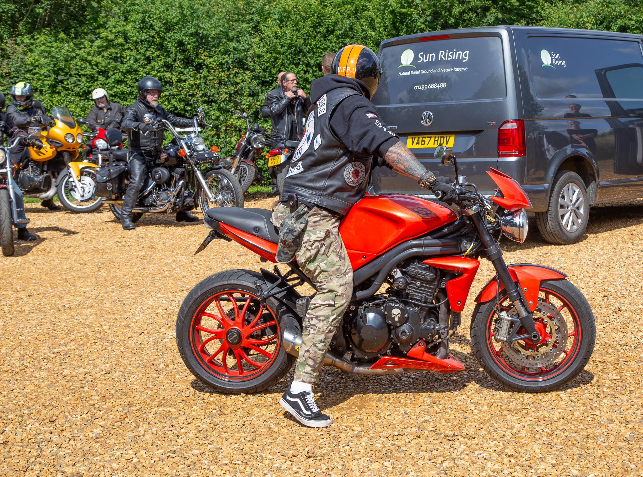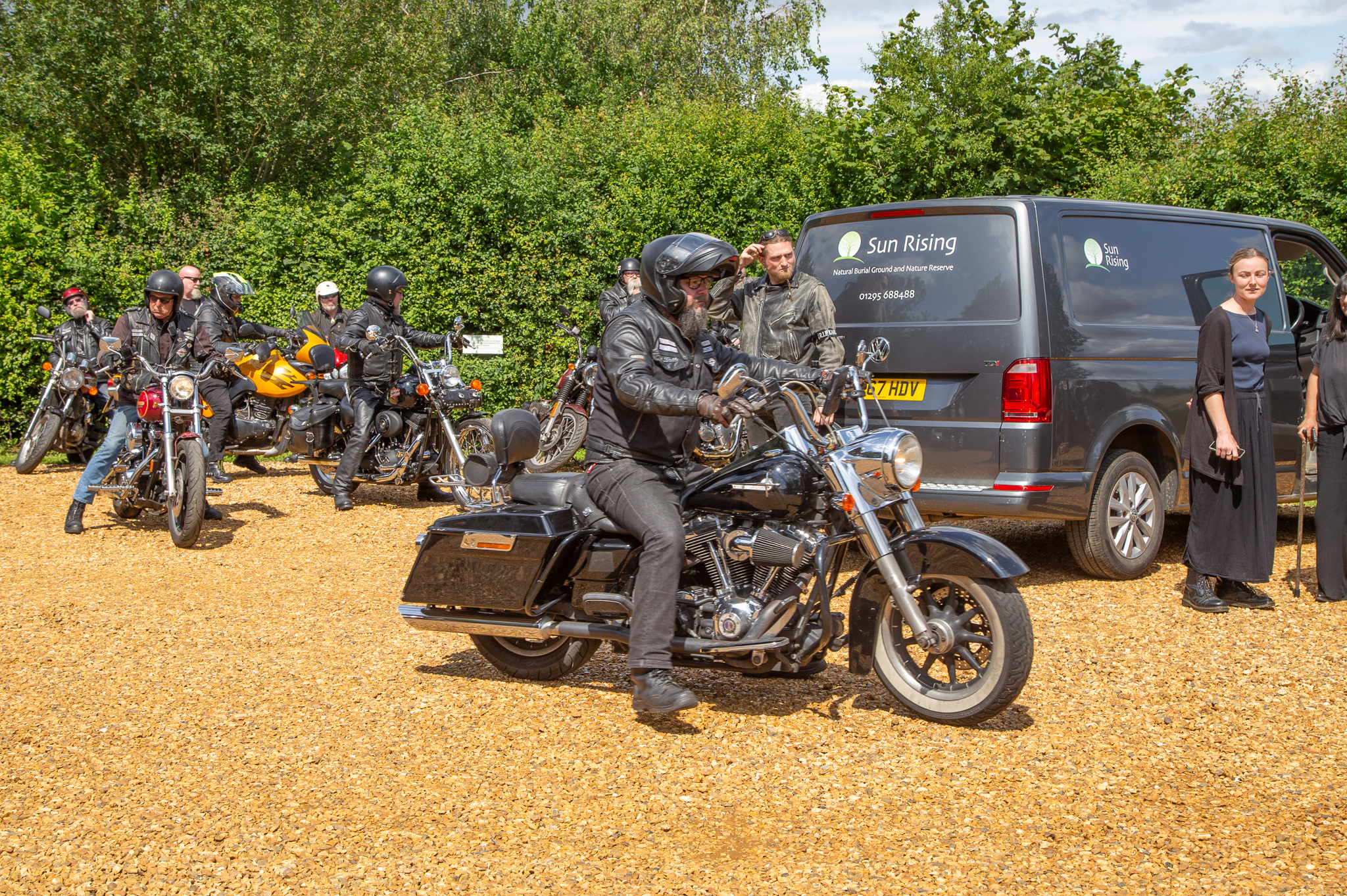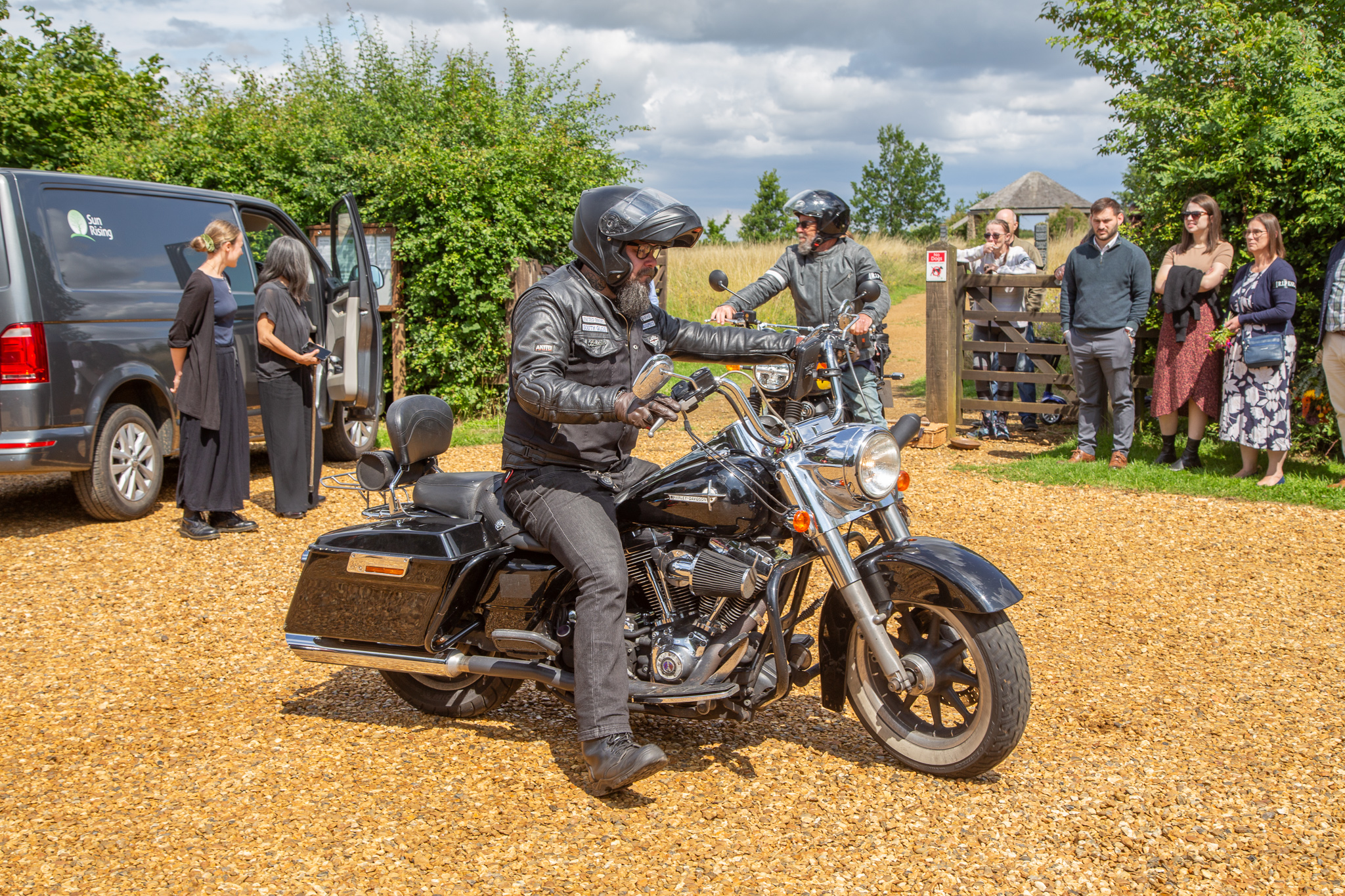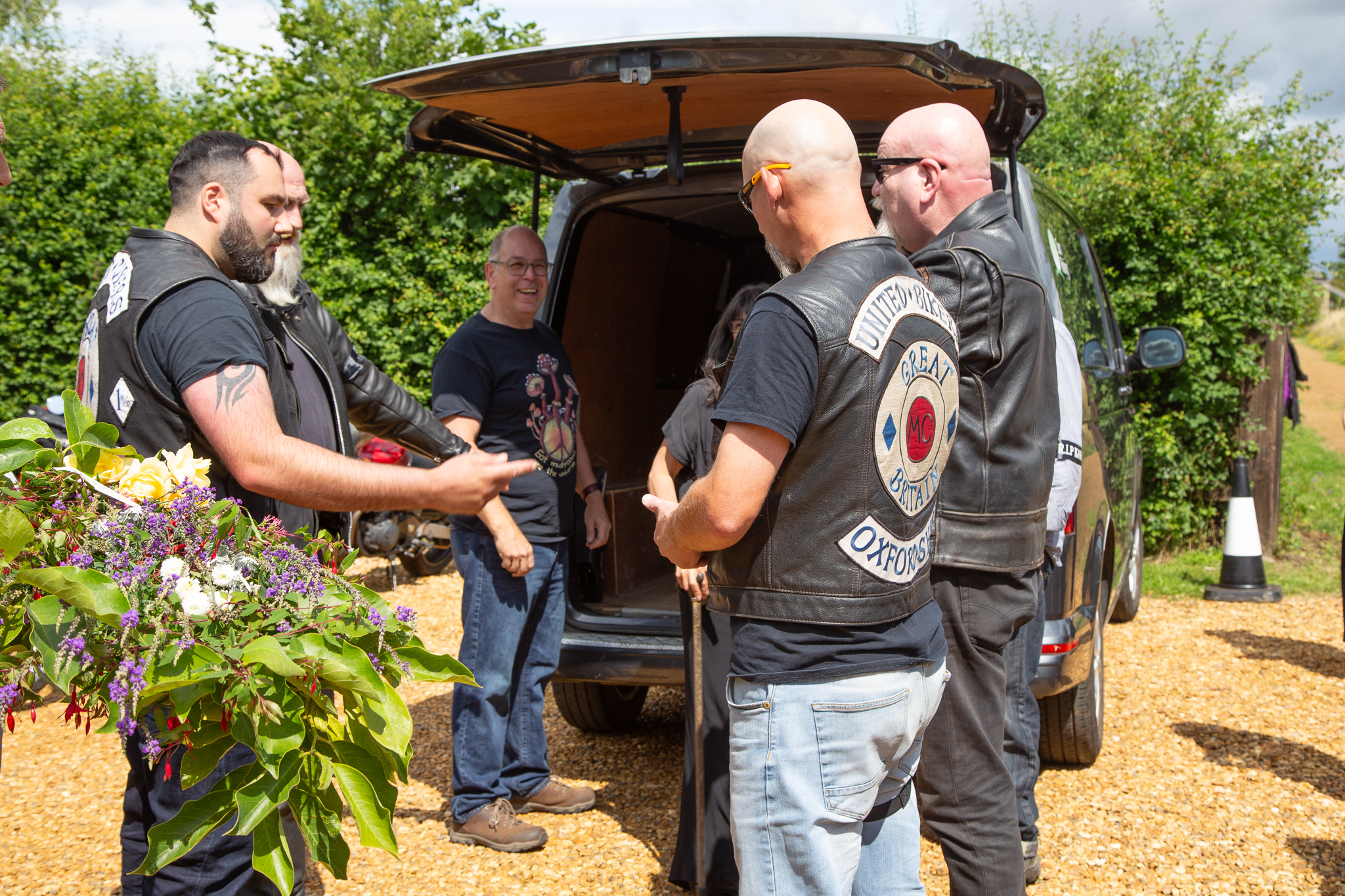 Bikers, family, and guests met up at the Musketeer pub. The bikers then set off (at high speed) to the funeral parlour. Meanwhile everyone else headed off to the funeral ground. A little while later the Hearse vehicle accompanies by the bikers arrived at the funeral ground. There were some 20-30 bikes/riders - very impressive and moving. The coffin bearers took the coffin to the round house where the funeral ceremony took place. There were many tributes from both family and from friends (some for 30-40 years). The another group of coffin bearers took the coffin to the burial ground. Unusually - after the coffin was lowered - guests were invited to cover the coffin; and finished with the final wreaths.