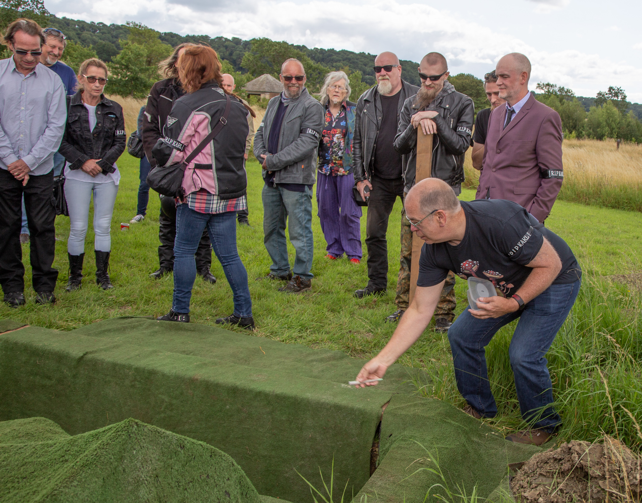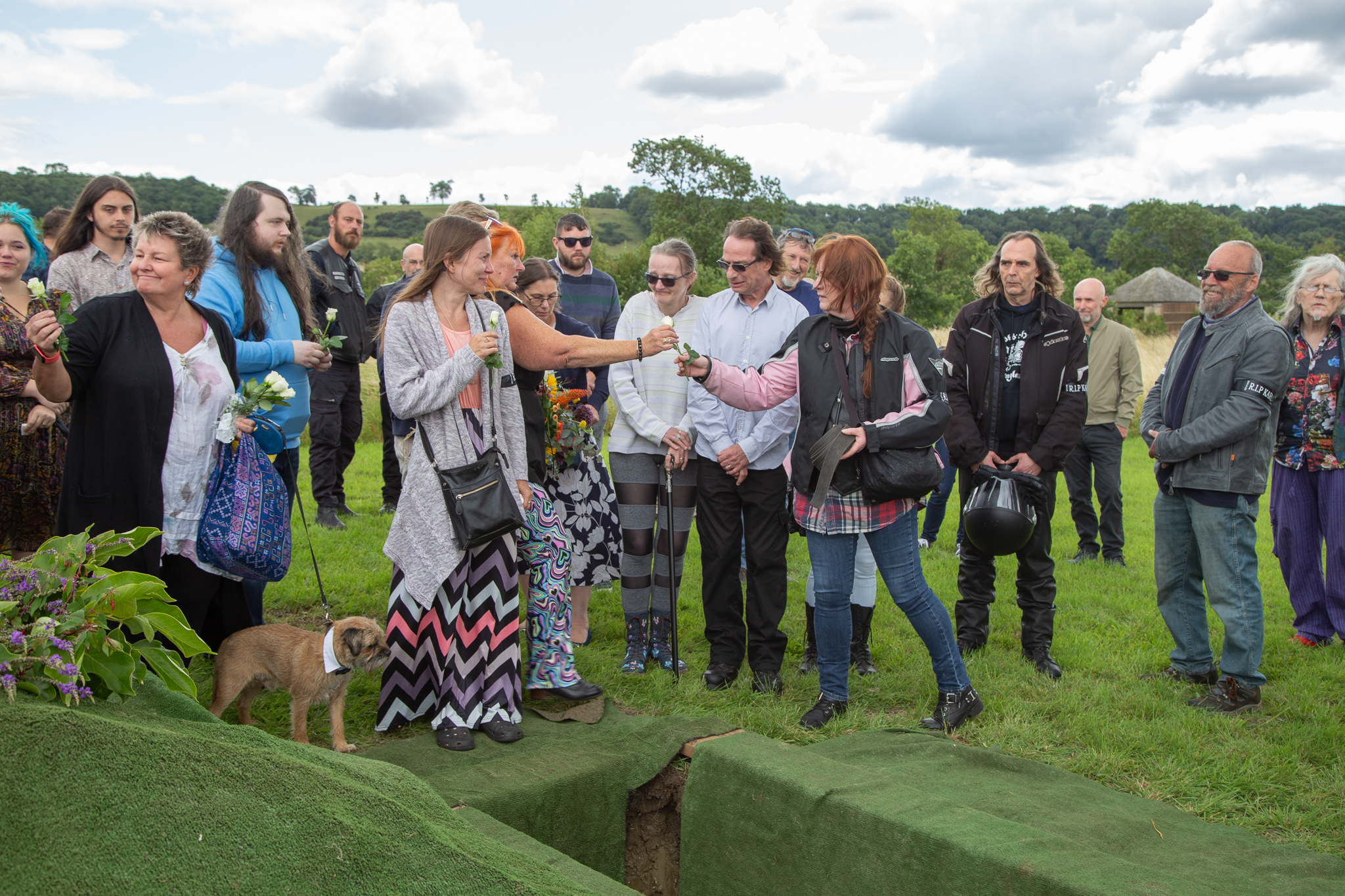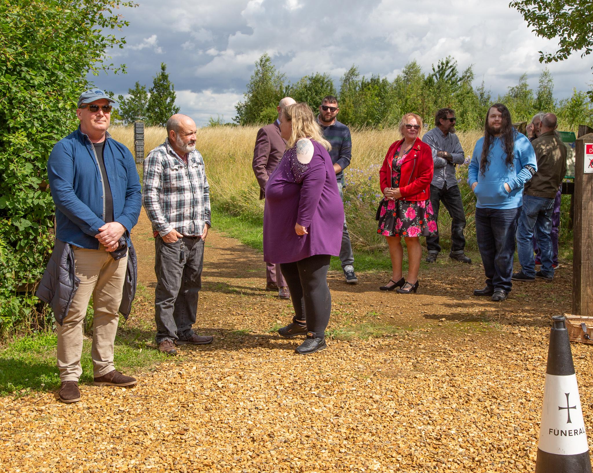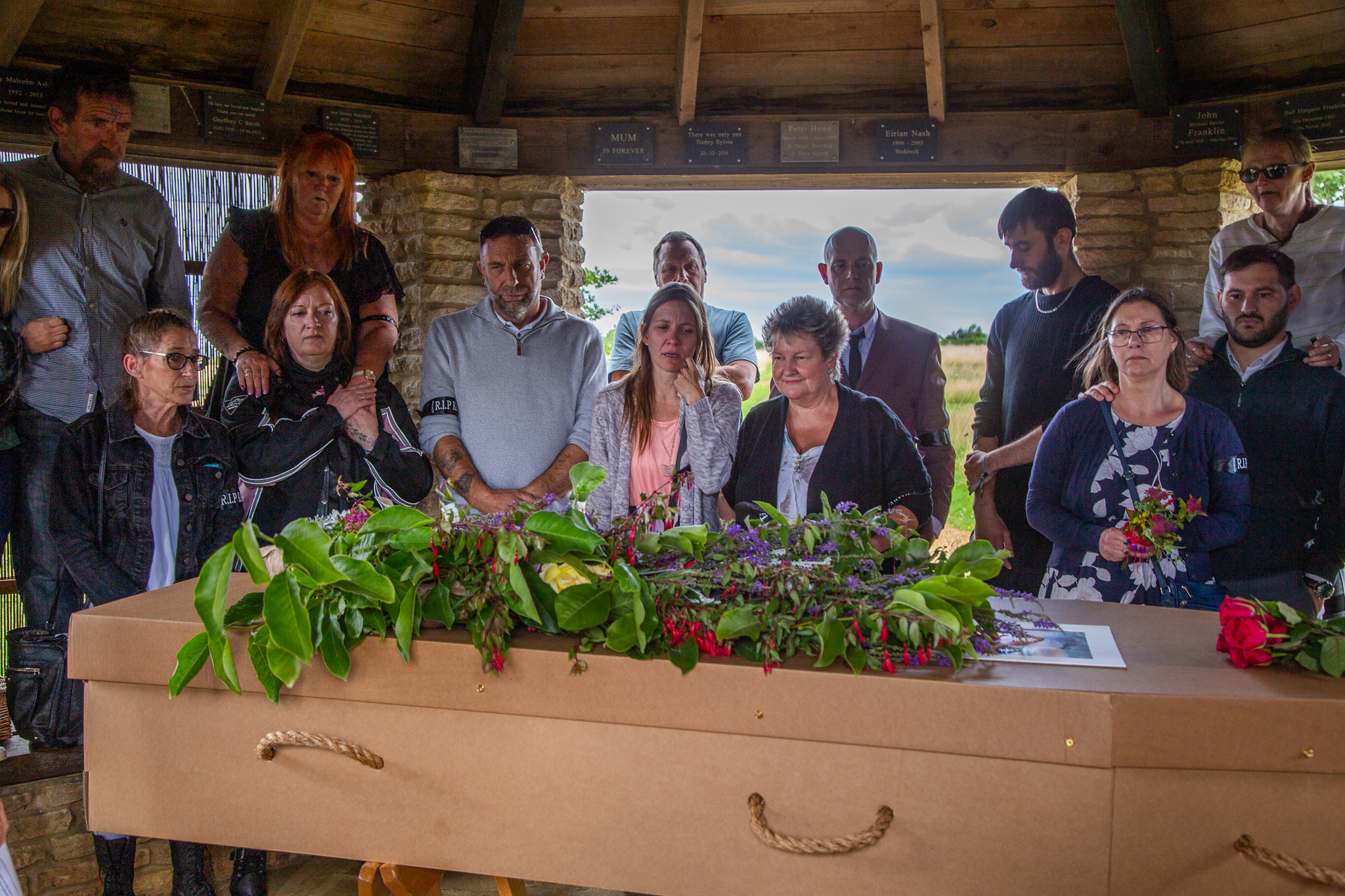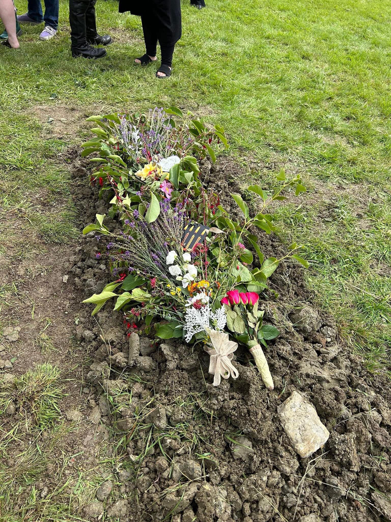 Bikers, family, and guests met up at the Musketeer pub. The bikers then set off (at high speed) to the funeral parlour. Meanwhile everyone else headed off to the funeral ground. A little while later the Hearse vehicle accompanies by the bikers arrived at the funeral ground. There were some 20-30 bikes/riders - very impressive and moving. The coffin bearers took the coffin to the round house where the funeral ceremony took place. There were many tributes from both family and from friends (some for 30-40 years). The another group of coffin bearers took the coffin to the burial ground. Unusually - after the coffin was lowered - guests were invited to cover the coffin; and finished with the final wreaths.